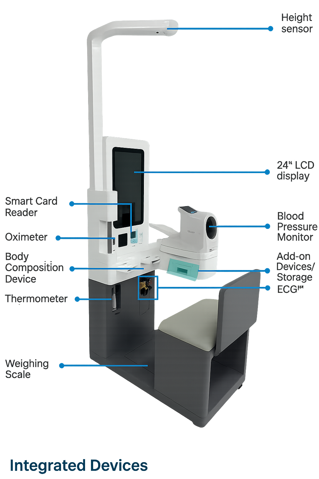 The Seated Medi-Kiosk is a fully integrated, interactive health-check station designed to deliver a complete and comfortable screening experience. Equipped with advanced medical-grade sensors, it enables users to independently measure essential health metrics with precision and ease.